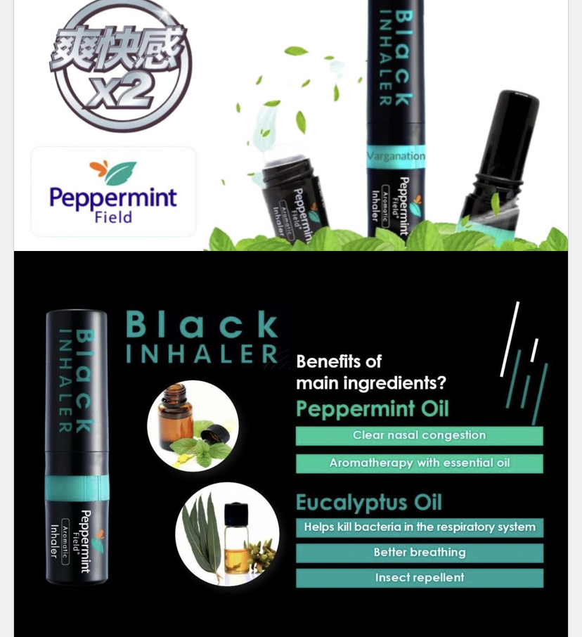 鼻通有兩邊,一邊係鼻通、一邊係雙倍薄荷油。 這款鼻通減少了薄荷🌿的成分比例,增加了尤加利的成分量,加強鼻子容易過敏、鼻塞者的改善問題! 它薄荷的清新香氣完美融合,創造出額外的清新香氣。僅含2%樟腦的配方,可以確保它對鼻膜是安全的。只需通過鼻子吸氣,將其擦在鼻子下方或太陽穴上,甚至將其放在口罩上即可更好地呼吸! Peppermint Field 主打年輕族群,Black Inhaler 結合搖滾 Rock Rock 的黑色設計, 打破傳統鼻通以往使用的白色,細細支,的的骰骰☺️ 超有型! 使用方法及功效: 鼻通薄荷棒分三段式設計兩種功效,打開前端蓋子是提神醒腦的吸(聞)鼻器,可適當緩解鼻塞或頭暈,並可重覆多次使用;下方轉開則是薄荷油,可在被蚊蟲叮咬或皮膚過敏時塗抹,或是將薄荷油抹在人中及太陽穴,也可幫助減緩頭暈等不適症狀。