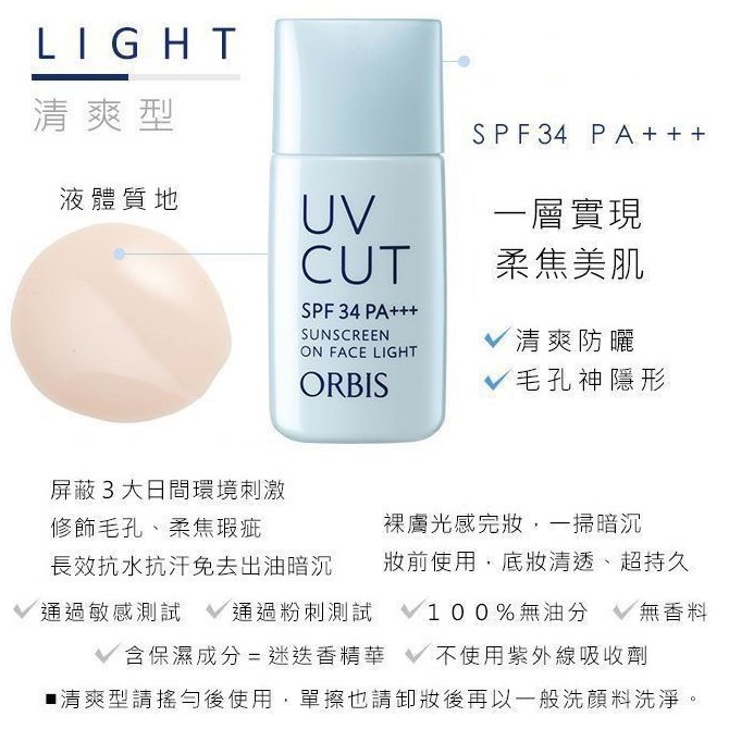 ORBIS - 奧蜜思透妍防曬隔離乳(清爽型)28ml -裸妝、抗UV、遮瑕、修飾毛孔一瓶完成 -SPF34.PA+++ 阻斷紫外線與近紅外線 -80%美容液成分 x 光感勻亮. -修飾毛孔、柔焦瑕疵 -長效抗水、抗汗,免去出油及暗沉 -裸膚光感完妝,一掃暗沉 -妝前使用,底妝清透、超持久 全年暢銷NO.1的ORBIS隔離霜天后,美肌再進化!裸妝、抗UV、遮瑕、修飾毛孔一瓶完成! SPF34.PA+++ 阻斷紫外線與近紅外線,全新滋潤防護配方形成的「環境因子防禦膜」隔離空汙懸浮粉塵,80%美容液成分X 光感勻亮LIGHTING POWDER,全方面提亮、透嫩、呵護! 通過敏感測試/通過粉刺測試/100%無油分/無香料/含保濕成分=迷迭香精華/不使用紫外線吸收劑 - 屏蔽三大日間環境刺激 - 修飾毛孔、柔焦瑕疵 - 長效抗水、抗汗,免去出油及暗沉 - 裸膚光感完妝,一掃暗沉 - 妝前使用,底妝清透、超持久 使用方法:使用前先搖勻,於肌膚處均勻塗上。為確保最理想防曬效果,建議大量出汗或以毛巾拭擦肌膚後重覆塗抹。 單擦也請卸妝後再以一般洗顏料洗淨。